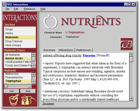 IBIS InteractionsDeveloped for Integrative Medical Arts Group, Inc. This product is a specialized database of drug/herb interactions, designed for use by practitioners, pharmacies, and insurance companies. Having successfully delivered two versions of IMA's flagship product, IBIS, we wer contracted to lead the design and engineering effort for this product as well. Like it's companion product IBIS, Interactions contains comprehensive seach and annotation features, presented with an easy-to-use index. Since we had built a series of custom tools for managing IBIS content, we expanded those tools to faciliate creation and editing of content in this new program as well, including a custom HTML editor specialized for this type of medical content.