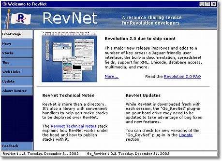 RevNetInternet application and service for Revolution and MetaCard developers. RevNet serves as proof-of-concept for the relative ease of building Internet applications with the Runtime Revolution. The system uses the MetaCard engine for both client and server-side operations. Since the content is aimed at developers using Revolution and MetaCard, the client is simply a small plug-in file that can be run within either development system. The plug-in downloads the content windws from one of our servers using simple HTTP, and provides script libraries and resources used by the downloaded content windows, keeping the content transfers to a minimum. Transmission time is further reduced by compressing files with gzip, decompressed on the fly by the client. The server provides CGI support for the system, updating the content on the fly based on user submissions. The client communicates with the server using standard POST commands, with most of the communication scripted in under an hour. The Go RevNet plug-in is available for download at the Revolution Embassy. |