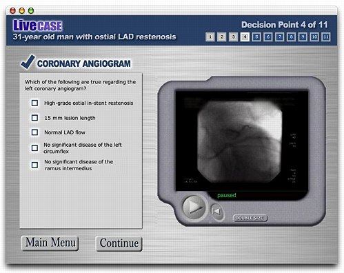 LiveCase Medical Training CD-ROMFor Dr. Edward Perper The instructional material for this computer-based training project was divided into 11 scenarios, each of which presented a challenge to the learner with a question to test their knowledge. Each answer invokes a different response, with instructional material unique for the answer given. A progress indicator at top shows the number of completed and remaining scenarios, and can be used for navigation as well. While the content and media elements each scenario was different, all scenarios used the same three-stage structure (presentation -> question -> feedback), suggesting a time savings in developing the project to the degree that its construction could be automated. This led to the creation of a simple multimedia construction language for this project. The aim of this language was to use the existing script format as delivered by the instructional designer as much as possible, with the addition of a few tags to distinguish content sections. The simplicity of the construction language makes it suitable for instructional designers to use directly, with the interpreter program written to be as forgiving as possible so the instructional designer can focus on content without being distracted by a more rigid tag structure such as XML. Template objects were created for each of the interface elements in a scenario, which were copied by the interpreter and modified based on the contents of the instructional script. The result was a a project delivered well under budget, with a foundation that could be extended to build a wide variety of tutorial programs.