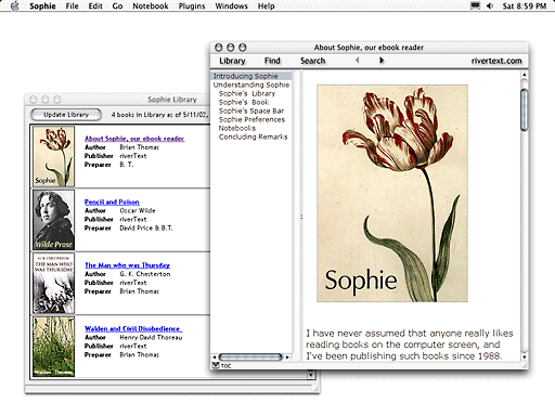 When you first open Sophie you'll see the Library window, shown at left below. Books are opened by just clicking their title. The e-book window can show chapters in the left margin to move about easily.