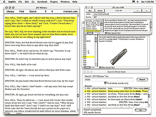 Passages can be selected and annotated in a Notebook. The Search tool lets you navigate among found passages quickly.